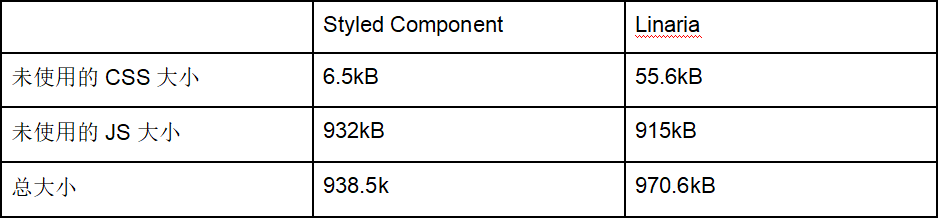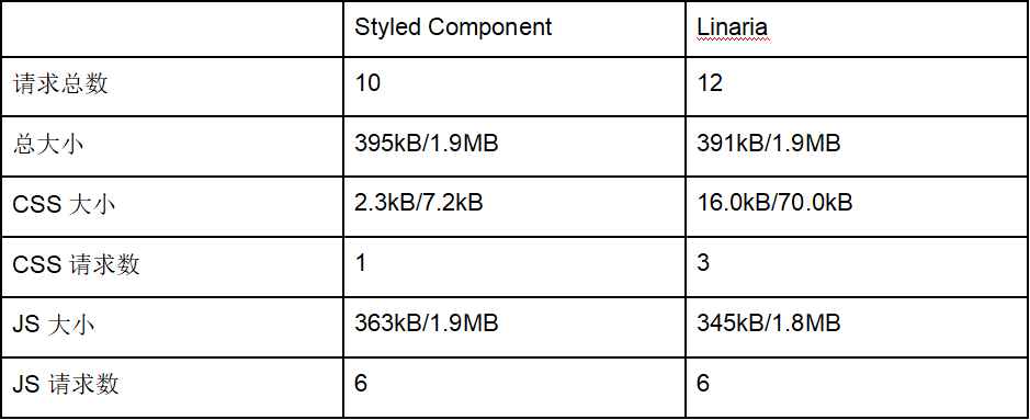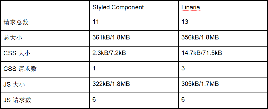 下面是使用 Styled Component 和 Linaria 构建的同一个主页的比较数据。斜线前的数字是经过压缩的大小,而斜线后是未压缩的大小。