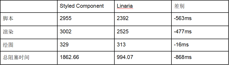 为了让你看到确切的数据,下面的表格详细比较了Styled Component(顶部)和 Linaria(底部)加载主页的性能。