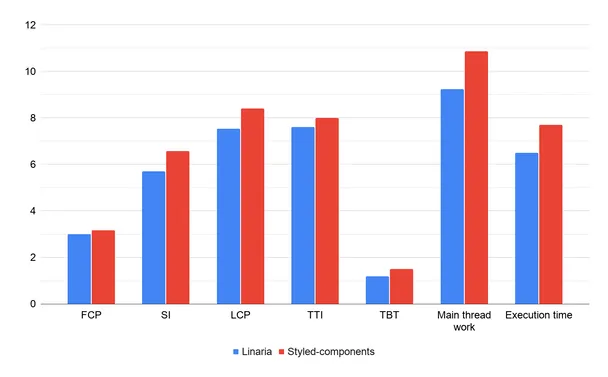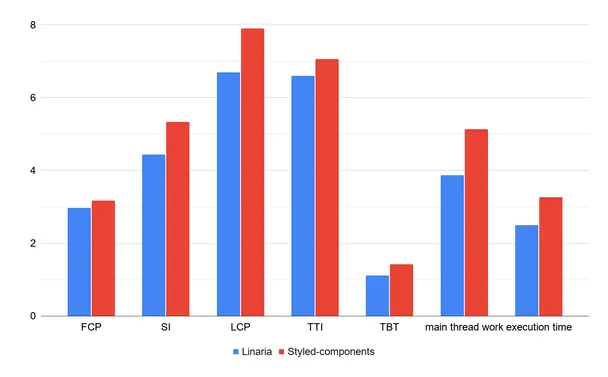 提起性能,就不得不使用 Lighthouse了。下面的图表显示了比较结果(3次比较的平均值)。除了一些 Web 的关键性能指标之外,我还比较了主线程的工作(解析、编译和执行资产的时间,其中最大的部分是 JS,但它涵盖了布局和样式计算、绘图等)和 JS 的执行时间。我省略了累计布局偏移,因为这个值几乎为零,而且 Linaria 和 Styled Component 之间几乎没有区别。