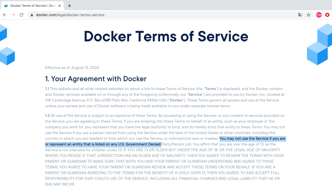 Docker 禁止被列入美国“实体名单”的国家、企业、个人使用