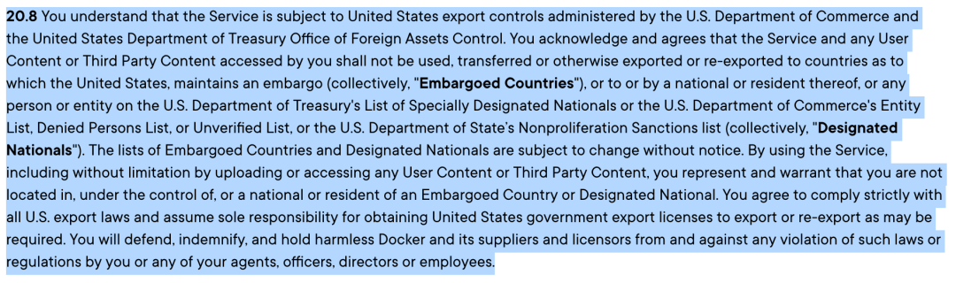20.8 该服务受美国商务部和美国财政部外国资产控制办公室管理的美国出口管制条例的约束。您承认并同意,该服务以及您访问的任何用户内容或第三方内容不得被使用、转移或者以其他方式出口或再出口到美国实施禁运的国家(统称为“被禁运国家”),或者美国财政部的特别指定国民名单或美国商务部的实体名单、被拒绝人士名单或未经验证的最终用户名单或美国财政部的不扩散制裁名单上的公民或居民,或者任何人或实体(统称为“指定公民”)。被禁运国家和指定公民的名单如有变更,恕不另行通知。如果使用服务,包括但不仅限于通过上传或访问任何用户内容或第三方内容,您表示并保证自己不在被禁运国家,不受被禁运国家的控制,也不是被禁运国家的公民或居民。您同意严格遵守所有美国出口法律,并根据需要,完全承担获得美国政府出口或再出口许可证的责任。您将确保Docker及其供应商和许可方免受您或您的任何代理人、管理人员、董事或雇员违反此类法律或法规所造成的影响。