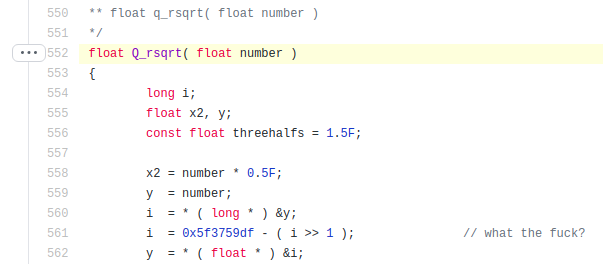 雷神之锤3竞技场是一款由id Software开发的第一人称射击游戏。该游戏于90年代开发完成,当时3D游戏行业刚刚兴起,游戏开发都使用id Tech 3游戏引擎。当时,硬件资源非常有限。因此,游戏开发人员必须编写精心优化过的代码,才能呈现诸多图形元素。许多游戏编程计算都需要进行向量归一化(这一步骤涉及求平方根倒数的计算)。如前所述,开发人员必须选择最有效的算法来处理与计算机图形学相关的工作。因此,雷神之锤3竞技场使用了一种非常聪明的方法,通过位级计算来快速计算平方根倒数,如下所示。