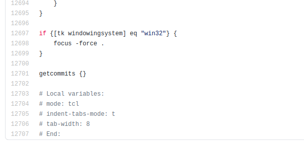 然而,我们可以通过Gitk这款视觉工具,快速看到修改内容。Gitk的整个源代码只有一个文件(https://github.com/git/git/blob/master/gitk-git/gitk)。它使用了Tk UI工具包(Tcl的扩展),以Tcl脚本语言编写而成。Gitk的作者仅通过一个源文件实现整个GUI应用,同时还选择了动态编程语言,开发出了更快的GUI应用程序。