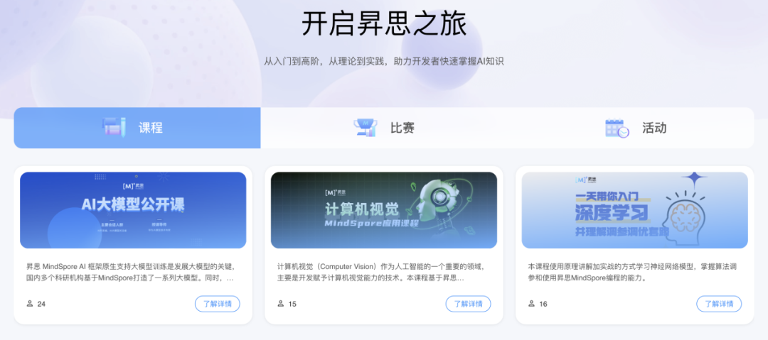 开发者作为创新的活水,昇思MindSpore积极拥抱开发者,便于开发者线上线下交流与学习,打造学习成长型社区。本次昇思大模型平台升级贴心为开发者提供课程模块,帮助开发者从入门到精通,深入浅出玩转昇思MindSpore。小编浏览了课程信息,在首页有AI大模型、计算机视觉、深度学习入门等课程,且均为免费学习,可以说超级宠粉了!