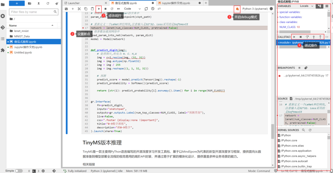 Jupyter集成了Formatter、Debugger、Git、Lsp等插件,提高开发者研发效率,带来绝佳的用户体验,如断点调试也不在话下: