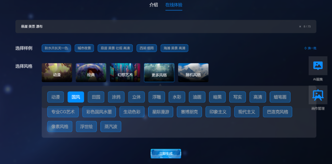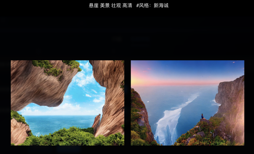 小编上手试了试本次升级后的效果,点击“在线体验”,输入提示词:悬崖、美景、瀑布。