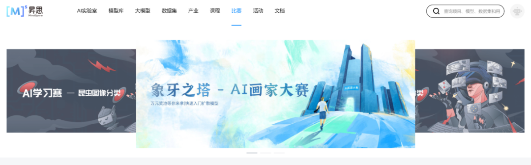 值得一提的是,昇思大模型平台特设比赛模块,定期开展AI相关的大赛,赛题涵盖AI基础领域如图像分类、文本分类、目标检测、风格迁移等,比赛形式多样,种类繁多。比赛还提供组队,提交结果,实时评分,排行打榜等功能。每年除了常规比赛以外,还开展特色比赛,例如正在进行中的“象牙之塔-AI画家大赛”,便是贴近当前热点技术,通过以赛促学、以赛促创的模式来助力AI人才的培养。