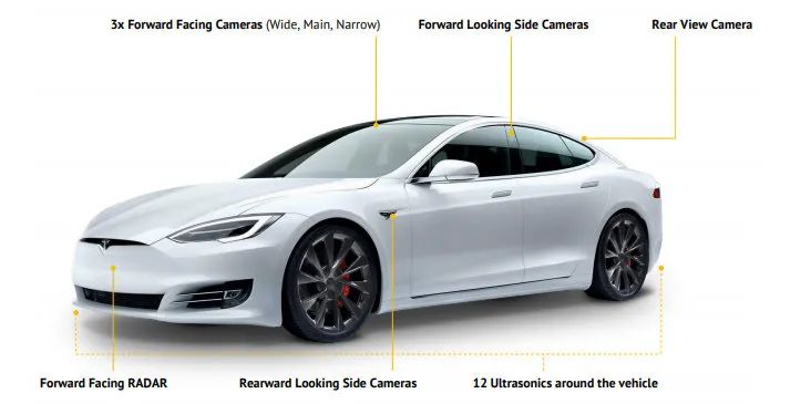 我估计大家可能对于特斯拉的方案更加感兴趣,所以先来说说特斯拉的方案。我在网上找到了这张概念图,大家英文不好没有关系,只需要知道图上标记的这些位置都是各种用途的摄像头就可以了。