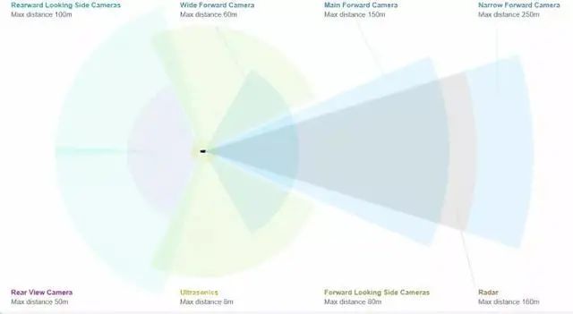 特斯拉采用的是V1R方案,即3个摄像头加上一个毫米波雷达,拥有3个前向摄像头以及一个77G毫米波雷达的传感器。下面这张图展示了车辆周身外能够感应到的距离,稍微有些模糊,我简单阐述一下,差不多就是往前最大可以感知到160米,左右两侧最大可以感知到60米,往后最大可以感知到100米。
