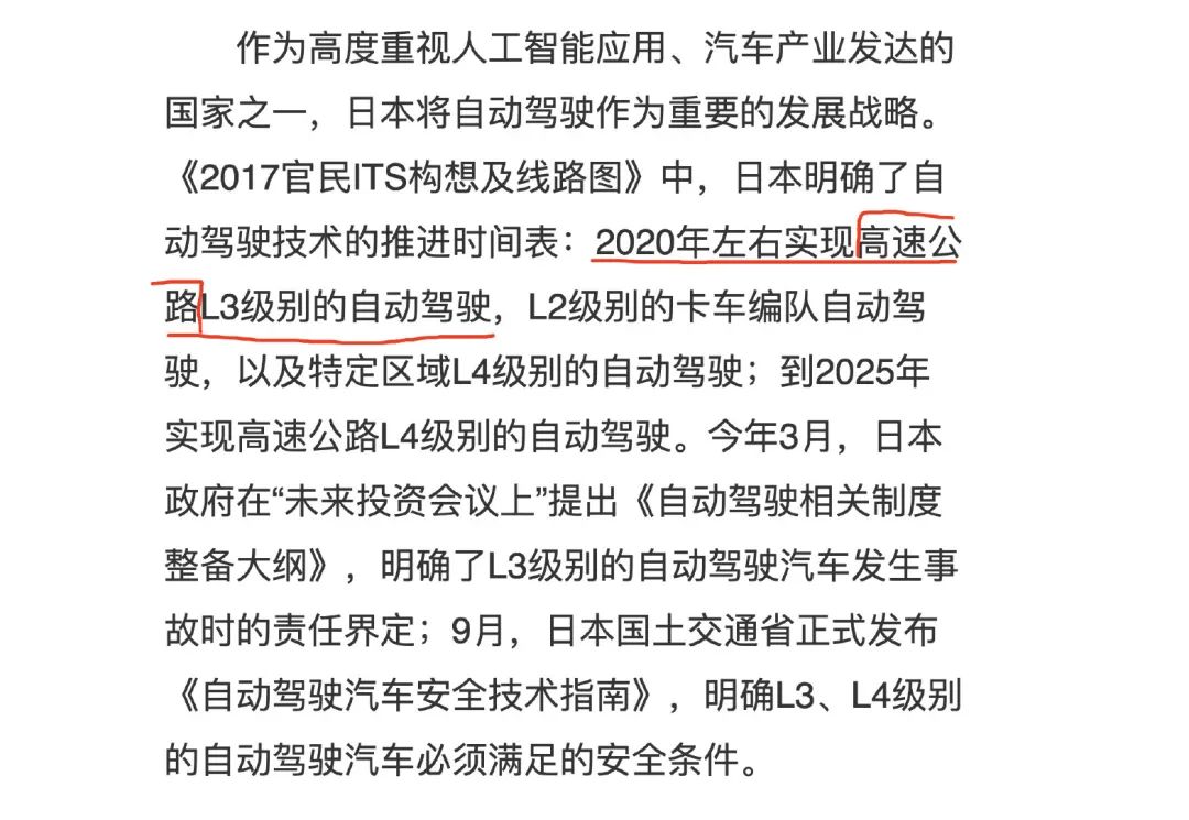 看到了吗,2020年左右实现高速公路L3级别自动驾驶。看到L3先别激动,先看看它前面有一个非常非常内涵的限定词就是“高速公路”。我个人觉得这其实基本上就等于L2水平的自动驾驶的意思,为什么我这么说呢,因为高速公路这个场景下会避免很多很多现实的问题。