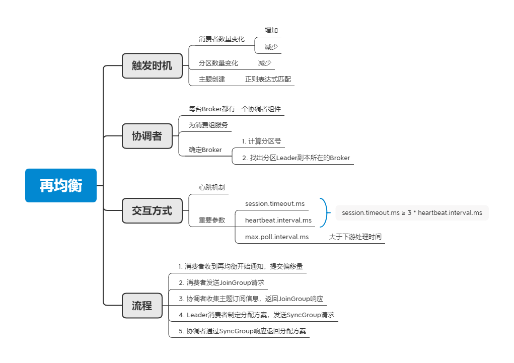 这一小节主要讲了协调者如何通知消费者开始再均衡,以及如何设置参数避免不必要的再均衡,下面我们看下再均衡的流程是怎么样的。