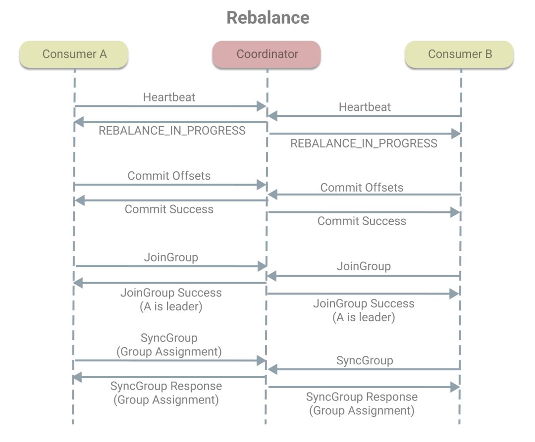 协调者,我们确定了。那协调者和消费者之间是如何交互的?协调者如何掌握消费者的状态,又如何通知再均衡。这里使用了心跳机制。在消费者端有一个专门的心跳线程负责以 heartbeat.interval.ms 的间隔频率发送心跳给协调者,告诉协调者自己还活着。同时协调者会返回一个响应。而当需要开始再均衡时,协调者则会在响应中加入 REBALANCE_IN_PROGRESS,当消费者收到响应时,便能知道再均衡要开始了。