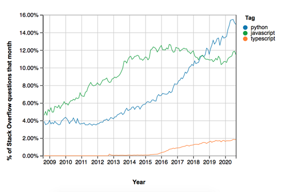 尽管 TypeScript 还很年轻,但在某些领域,TypeScript 已经成为不可避免的趋势。这增加了它的流行度。比如,当 Google 宣布 Angular.js 将于 2016 年与 TypeScript 一起运行时,StackOverflow 上 TypeScript 的标签数量激增。
