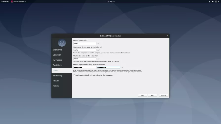 接着,在“Users”页面中,创建用户账号和密码,当然也可以选择自动登录,无需输入密码。