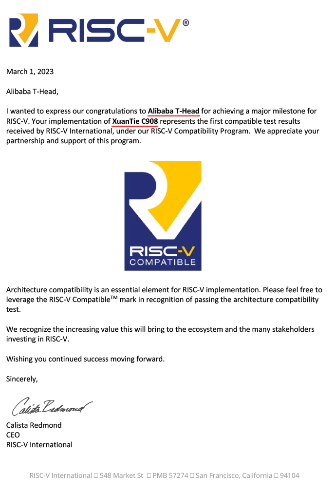 RISC-V生态的蓬勃发展,呼唤指令集标准的统一,中国企业在推动RISC-V国际标准建设中发挥了关键作用。RISC-V国际基金会CEO Calista Redmond会上介绍,基金会22位高级会员中有12名来自中国。在国际标准建设中,平头哥领导了其中的11个主要技术小组,推动了29个技术方向的标准制定,是公认的投入力量最大的中国机构。平头哥拿到了全球首张架构兼容性测试证书。此外,平头哥还在持续推动RVV1.0架构标准、面向人工智能的全新Matrix矩阵标准以及RISC-V安全技术标准等。