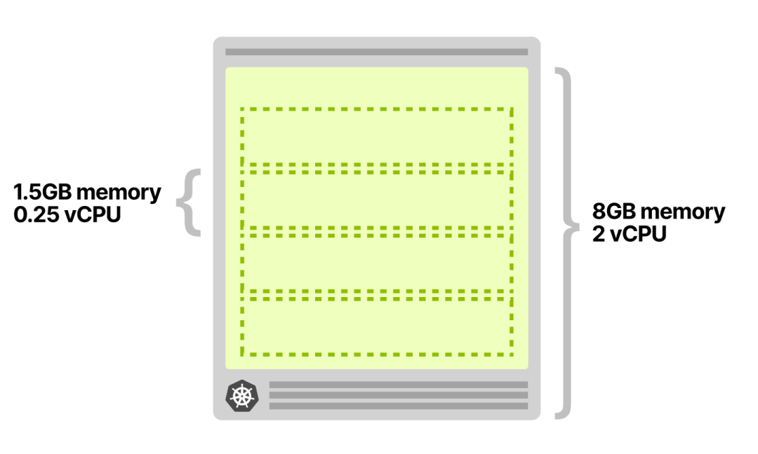 比如一个应用需要 1.5 GB 内存和 0.25 个 vCPU。一个 8GB 和 2 个 vCPU 的节点,可以容纳 4 个这样的 Pod,完美!