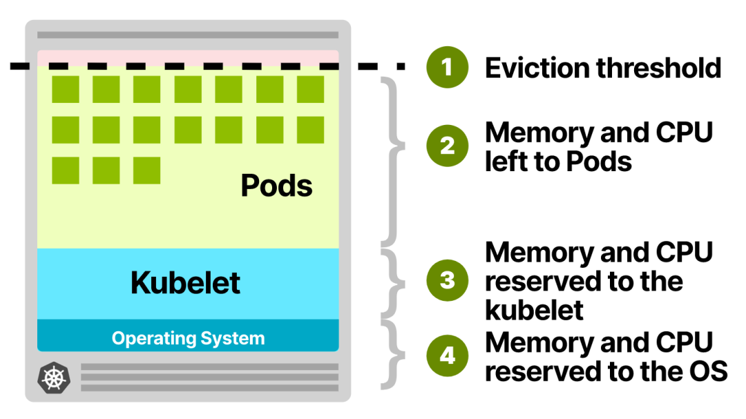 节点上的操作系统进程和 kubelet 也会消耗一部分资源,8G 和 2 vCPU 并不是全都可以提供给 Pod 用的。并且还有一个驱逐阈值[5]:在节点系统剩余资源达到阈值时,会驱逐 Pod,避免 OOM 的发生。
