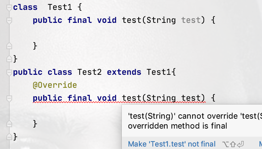 如上代码所示,可以看到会出现 cannot override ,overridden method is final 的编译错误提示