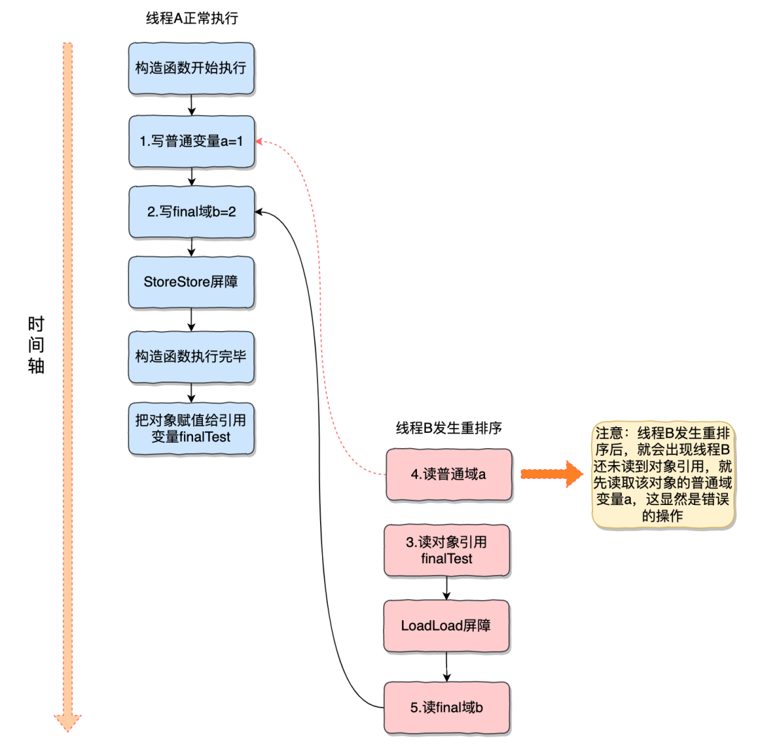 可以看到,由于读对象的普通域被重排序到了读对象引用的前面,就会出现线程 B 还未读到对象引用就在读取该对象的普通域变量,这显然是错误的操作。而 final 域的读操作就“限定”了在读 final 域变量前已经读到了该对象的引用,从而就可以避免这种情况。