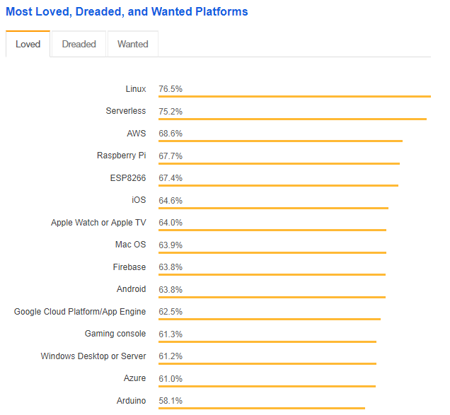 Linux 再次成为开发者最喜爱的开发平台,今年 Serverless 也很受欢迎。Sharepoint 连续第二年成为开发者最讨厌的平台,很多开发者最想在 Android 平台和树莓派上进行开发工作。