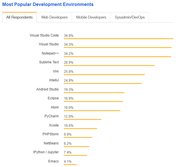 Visual Studio Code 略微领先 Visual Studio,成为最流行的开发环境工具,但不同类型的开发者有不同的选择。移动 App 开发者更倾向于选择 Android Studio 和 Xcode,DevOps 和系统管理者的最常选择则是 Vim,数据科学家更可能选择 IPython/Jupyter、PyCharm 和 RStudio。