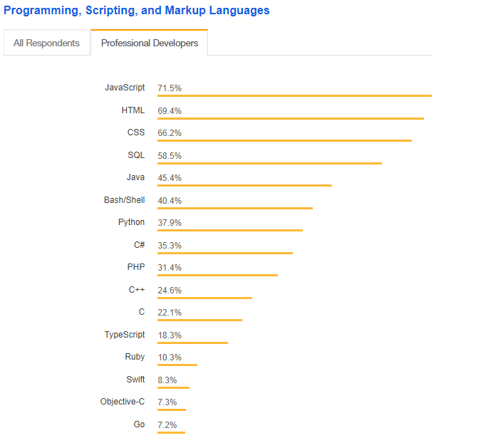 JavaScript 仍然是专业开发人员中使用最广泛的编程语言,这使得这六年间成为 Web 开发语言的巅峰,其他 Web 技术包括 HTML(排名第 2),CSS(第3)和PHP(第9)。面向业务的语言也被广泛使用,其中排名第 4 是 SQL,第 5 是 Java,第 8 是 C#。Shell 排在第 6, Python 出现在第 7,系统编程语言 C ++ 进了前 10 名。
