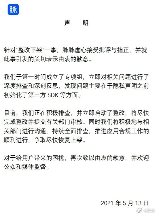脉脉因“App 整改下架”事件致歉:将进行排查整改