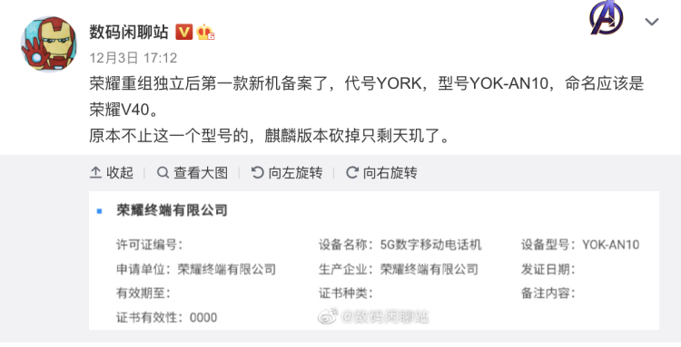 微博数码博主@数码闲聊站 表示,荣耀自华为独立后的第一款新机现已备案,该机代号为 “YORK”,型号为“YOK-AN10”,命名预计为荣耀V40,将搭载联发科天玑系列5G芯片。该机申请单位和生产单位均为 “荣耀终端有限公司”,这正是新荣耀独立后的主体。